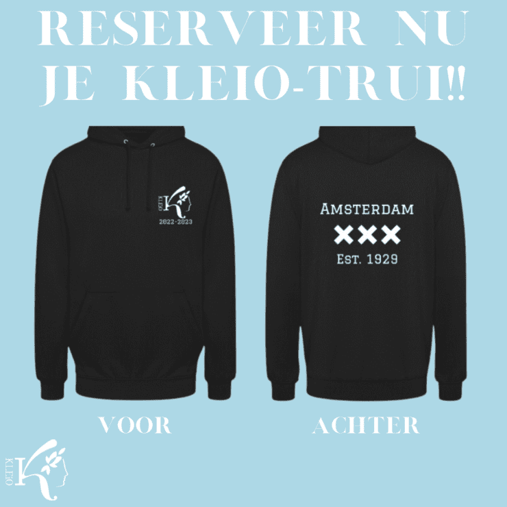 We hebben dit jaar weer een prachtige trui ontworpen Ook dit jaar heeft Kleio een prachtige tui ontworpen: een zwarte hoodie die, naast dat hij goddelijk zit, ook nog eens liefde voor de vereniging uitdraagt. Deze wil je hebben!